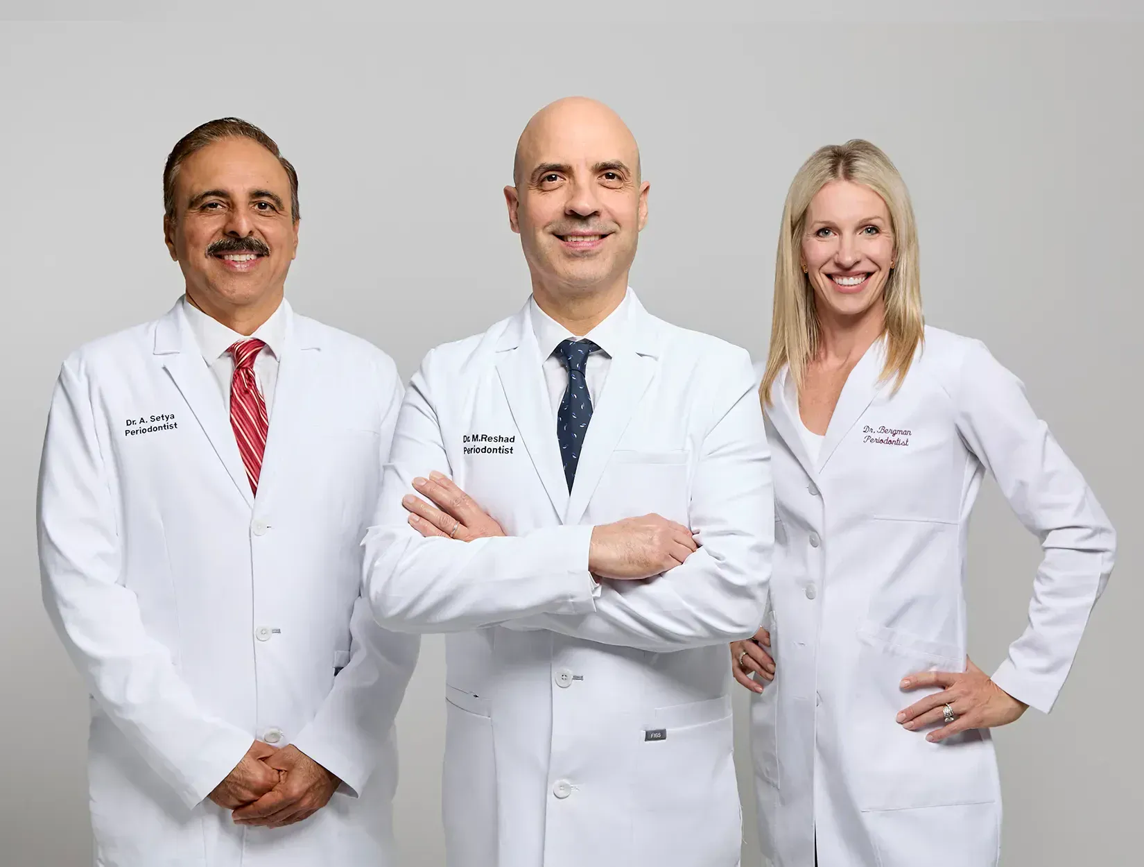 - 3 board-certified periodontists—Dr Reshad, Dr Setya & Dr Bergman—each with dual-specialty degrees